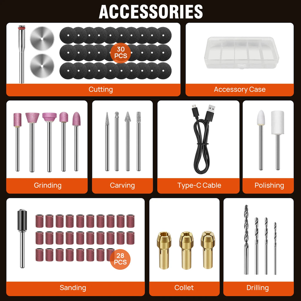 【5 VARIABLE SPEEDS ADJUSTMENT】With 5 adjustable speeds (3000/6000/9000/12000/18000 RPM), our mini rotary tool empowers you to effortlessly tackle any small DIY project. Even if you're a beginner, still can experience effortless control joy. The cloud-lightweight feeling reduces hand strain, allows you to work for hours without fatigue.