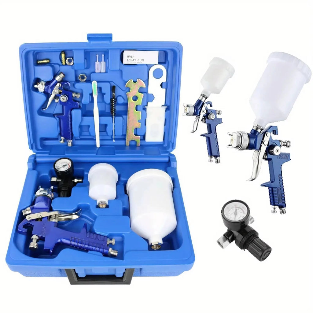 【Rich Accessory Set】2 HVLP spray gun set with 0.8mm and 1.4mm nozzles, 125ml and 600ml capacity paint cups and 1 Pressure regulating gauge.