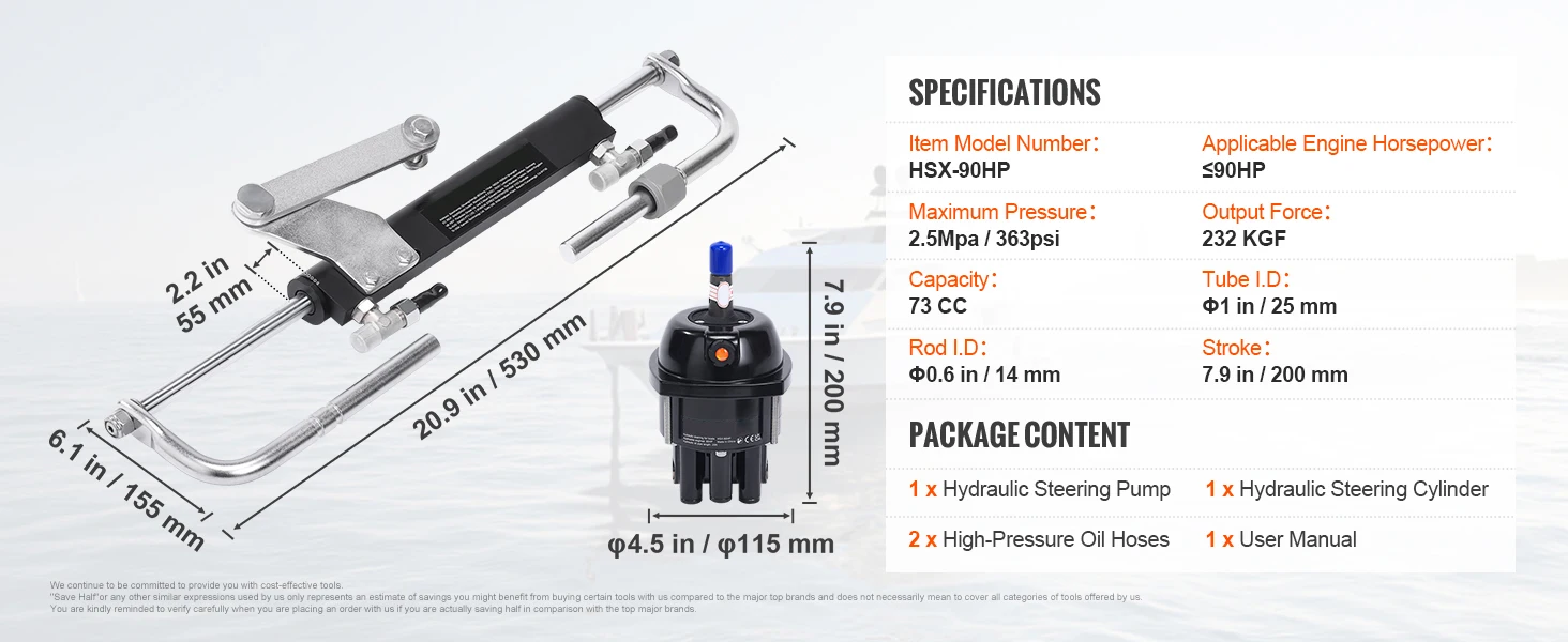 • Compatible with outboard motors up to 90 HP, this hydraulic steering kit integrates effortlessly with popular brands such as Yamaha, Suzuki, Honda, Mercury, Nissan, and Tohatsu. Enjoy smooth and accurate steering control for a premium boating experience.