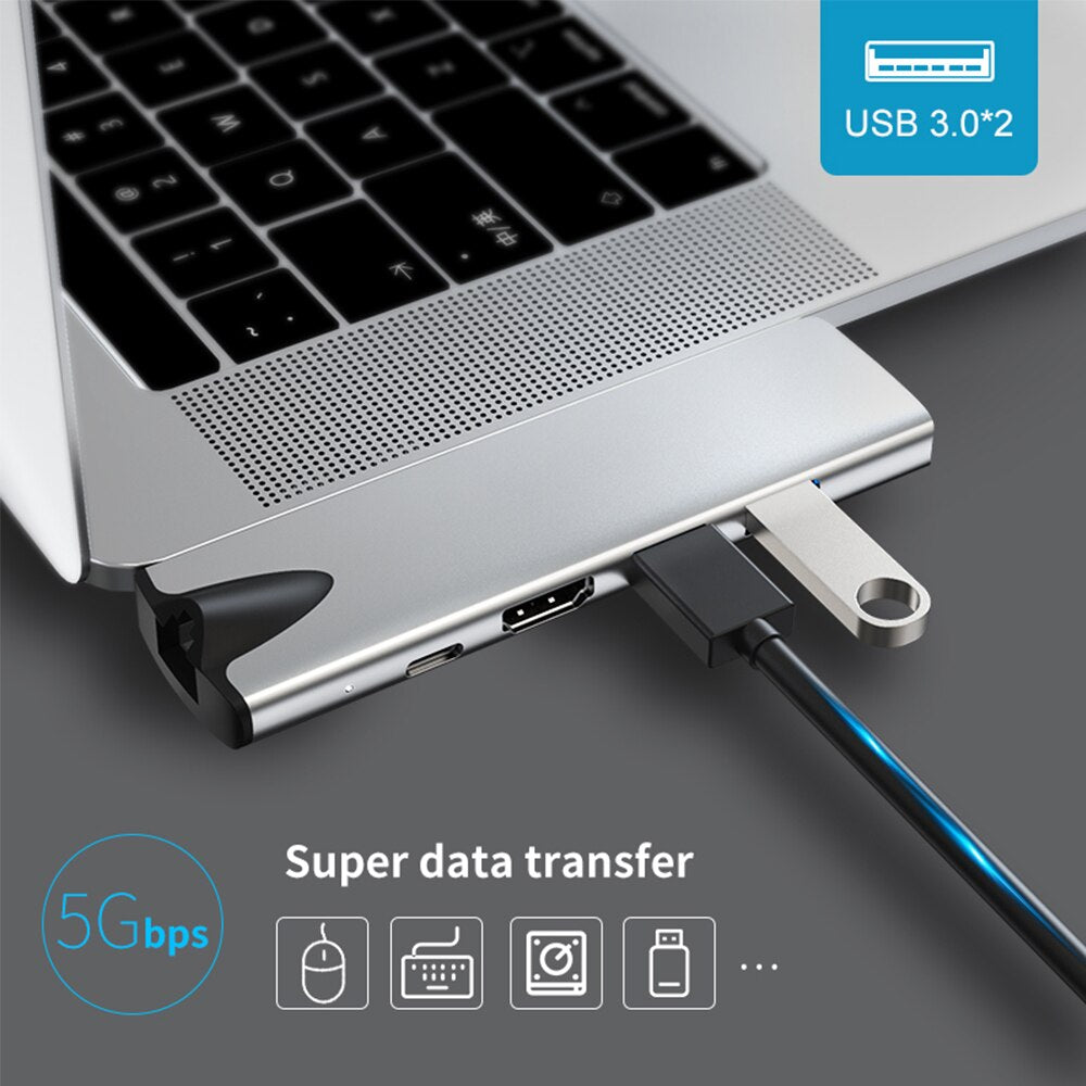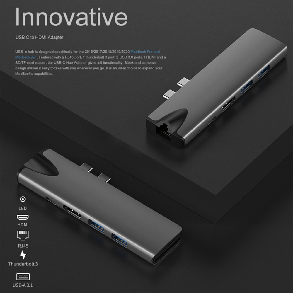 [Specially Designed for MacBook Pro/Air] USB C hub specially designed for MacBook Pro 2020/2019/2018/2017/2016 13" &15" & 16" and MacBook Air 2020/2019/2018, expand the two USB C ports on MacBook Pro/Air into Seven: HDMI 4K Output,RJ45,Type-c female PD charging Port9(100W/Support Thunderbolt3), 2 USB-A 3. 0 ports and SD&TF card reader slots. Meet all your needs with one hub. Plug and play to expand your MacBook capabilities, convenient for taking it with you on-the-go.