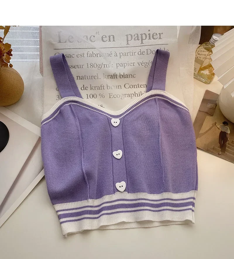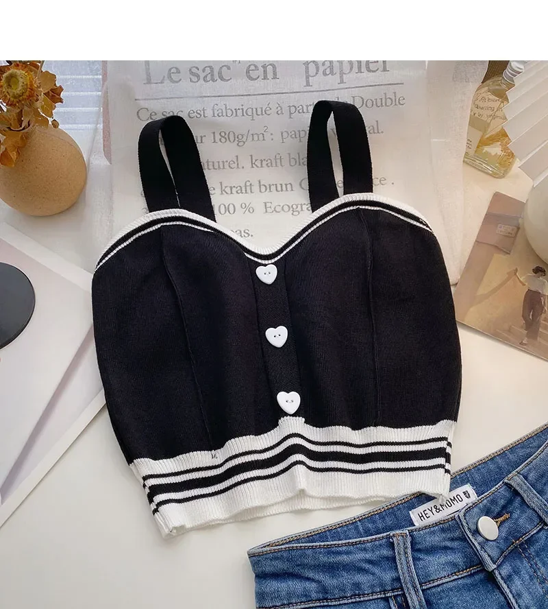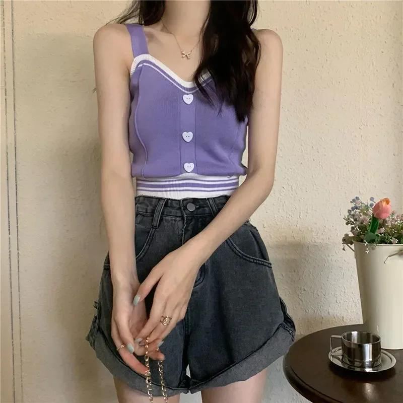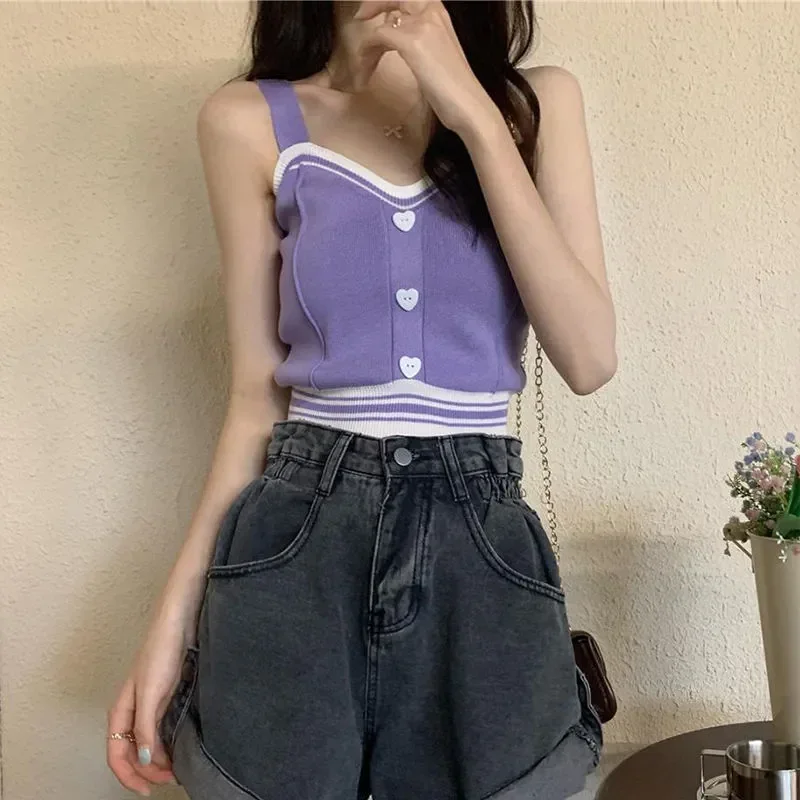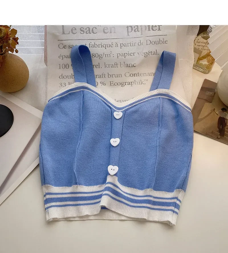 Women Y2K Cute Tops With Buttons Knitted Crop Tops Ladies Camis For Summer Tops Knit Patchwork Top Women Summer