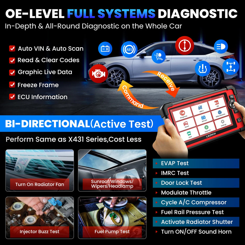 Bidirectional Control(Active Tests): Same as X431 Series, Receive information and send the commands to the system/components to perform specific tests, like EVAP Test, Fuel Pump Test, Cooling Fan Test, Window/Door Locks, etc. Significantly reduce your diagnostic time.