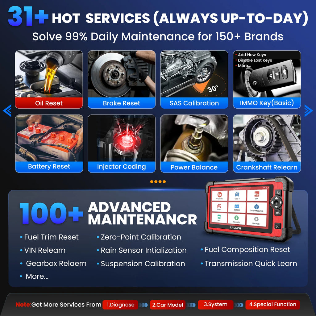 LAUNCH X431 CRP919E comprehensive automotive diagnostic scan tool also provides quick access to the vehicle systems for 100+ MORE advanced services functions for specific vehicle models, such as: Zero-Point Calibration, HVAC Calibration, Seat Calibration, Suspension Calibration; Idle Relearn, VGT Relearn, VIN Relearn, Transmission Quick Learn, Relearn Vehicle Data; SWS Initialization, ABS Initialization, Initialise rain sensor, Initialise front wipers; Clutch Adaptation, Transmisson Adaptation, Fuel Injector Adaptation; Turbocharging, Hybrid Control Compression Test, etc.