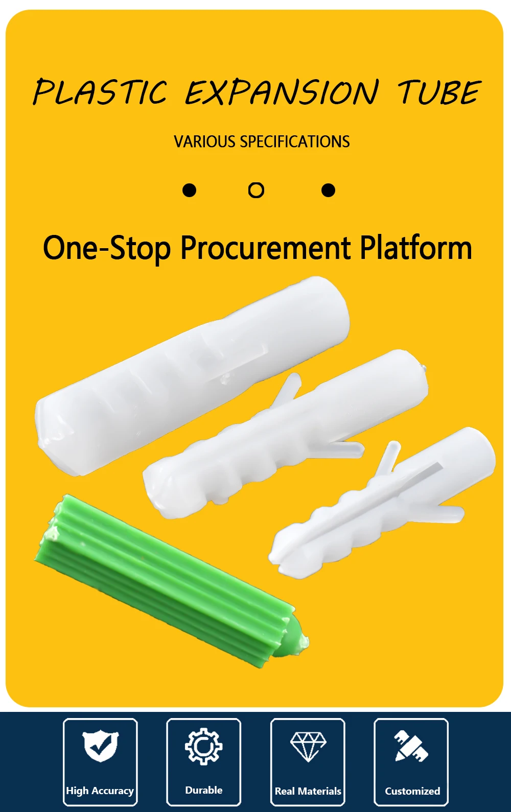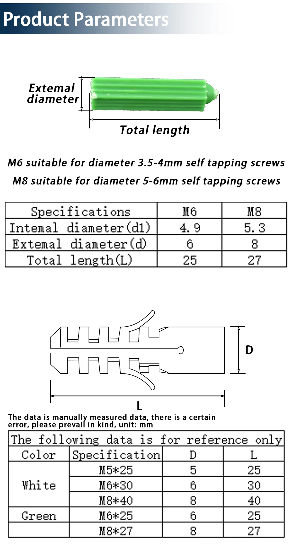 M5 M6 M8 Plastic Expansion Tube Rubber Plug Wall Plastic Pipe Nylon Plunger Expand Screw Anchors Green and White 25/50/75/100PCS