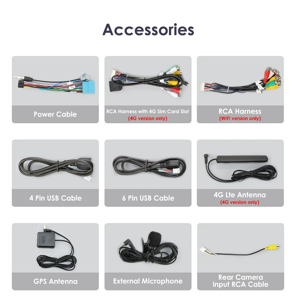 Standard Accessories: which ship with the head unit together(but please pay attension to the red words of accessory whether can get or not which depends on the item option you choose to buy it)