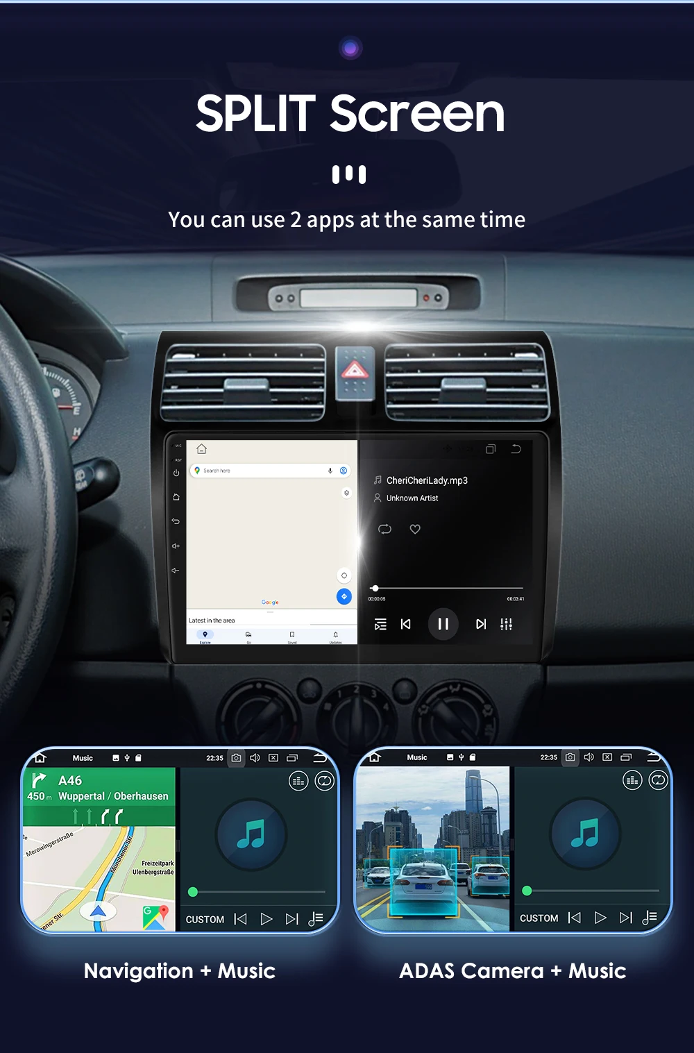 Split Screen : You can use 2 apps at the same time (such as: Navigation + Music , ADAS Camera + Music ,etc.)