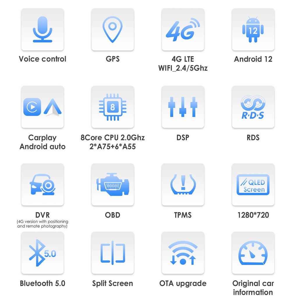 Special Features: Built-In Speaker/Microphone,wifi function,Support steering wheel control,Support 4G Network,Built-in GPS,Mobile Phone,MP3 players,Voice Control,dsp,CarPlay,android auto,Reversing Input,Split Screen