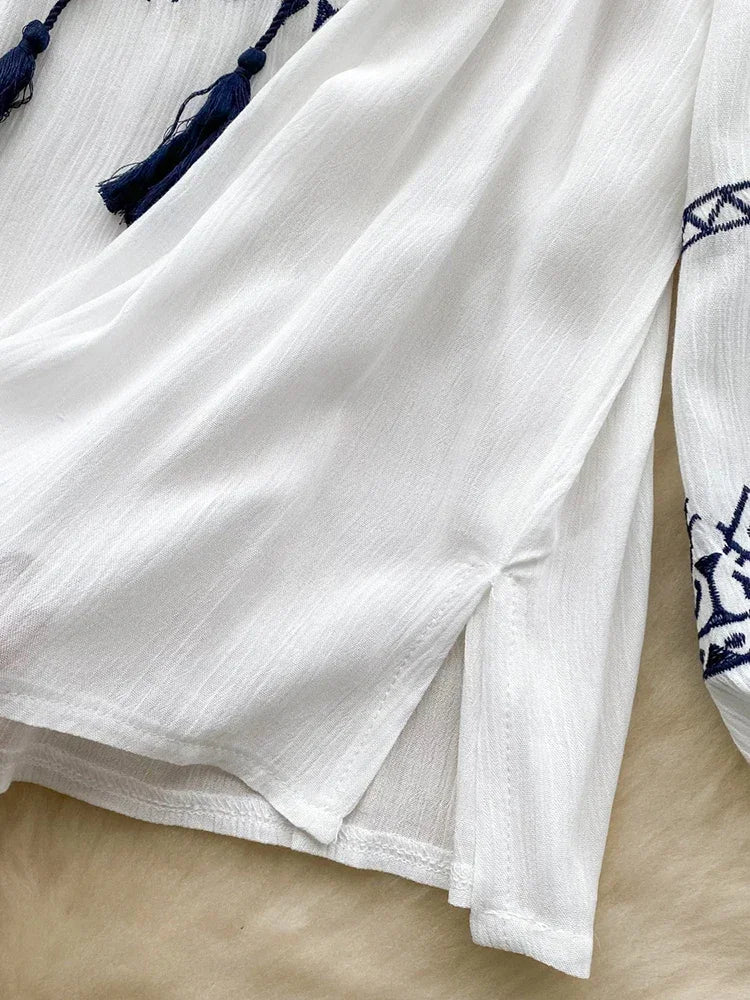 Women's Bohemia Blouse Embroidered Autumn Spring O-neck Collar Bow Tie Lantern Sleeve Top Blusas Mujer Female Tops BL020