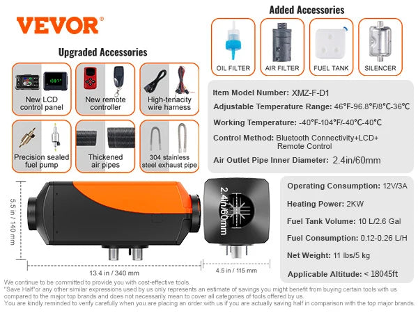 Efficient Heating: Heater Power: 2 KW; Rated Voltage: 12 V. Applicable Range: 108-161 ft²/10-15 m². Our diesel air heater adopts a sandblasting aluminum heat exchanger for rapid heat production and transfer, ensuring a comfortable temperature inside your vehicle, boat, or cabin within 10 minutes.