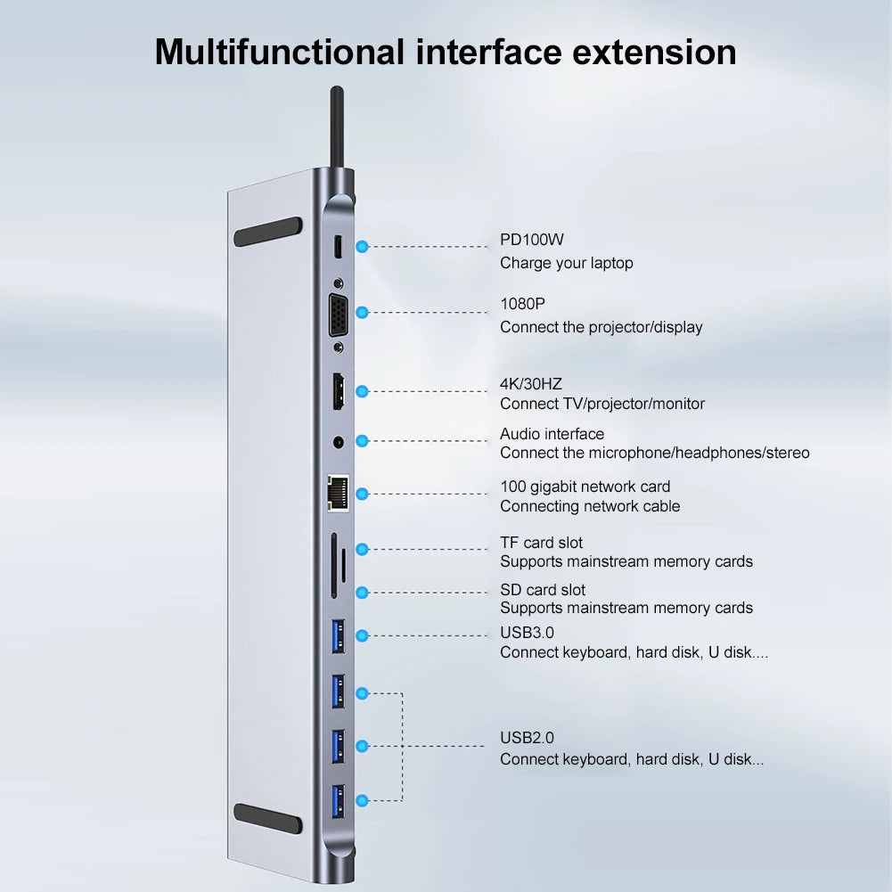 1. 11-in-1 USB-C Docking Station: This versatile docking station USB-C hub features a PD100W port, 1080P and 4K HDMI-Compatible outputs, audio jack, Gigabit Ethernet, TF and SD card slots, and multiple USB ports. It meets all your connectivity needs in one compact solution.