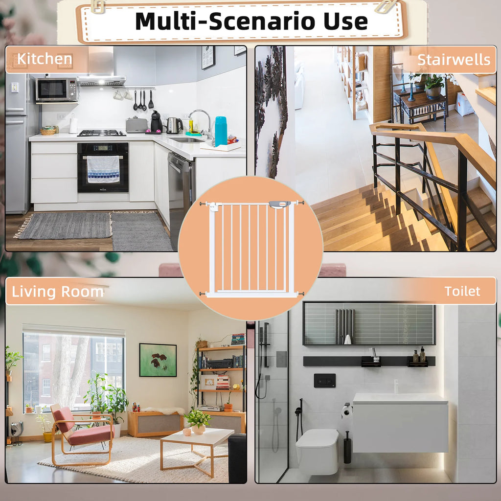 Robust and durable material: the baby safety gate is made of high-quality ABS and steel tube materials, not easy to fade. Locking pin at the bottom of the door, 2-way lock, automatically locks into the child lock when closed. The double locking system protects even the most adventurous child and provides maximum safety. Gate can be quickly removed from the opening for easy storage.