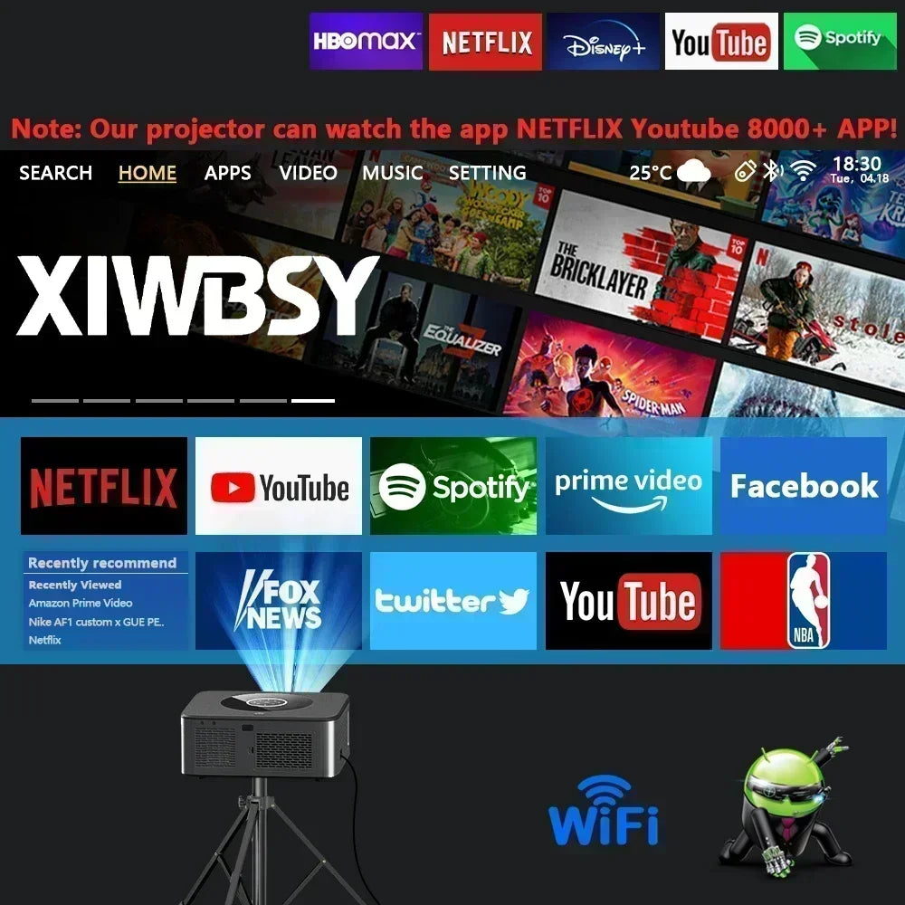 XIWBSY 25000 Lumens Android 4K LED Projector 800ANSI WiFi6 Bluetooth Projector Video Home Theater Auto Focus/Keystone Proyector
