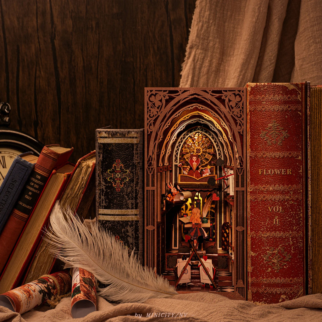 【MiniCity Original Design】 The theme concept design comes from 𝗔𝗹𝗶𝗰𝗲'𝘀 𝗲𝘃𝗶𝗱𝗲𝗻𝗰𝗲 of Alice in Wonderland. An overblown storyline, vivid dreams, something new and captivating,all of this is highly engaging for readers. The DIY book nook kit offers an array of imaginative scenes that will take your breath away.