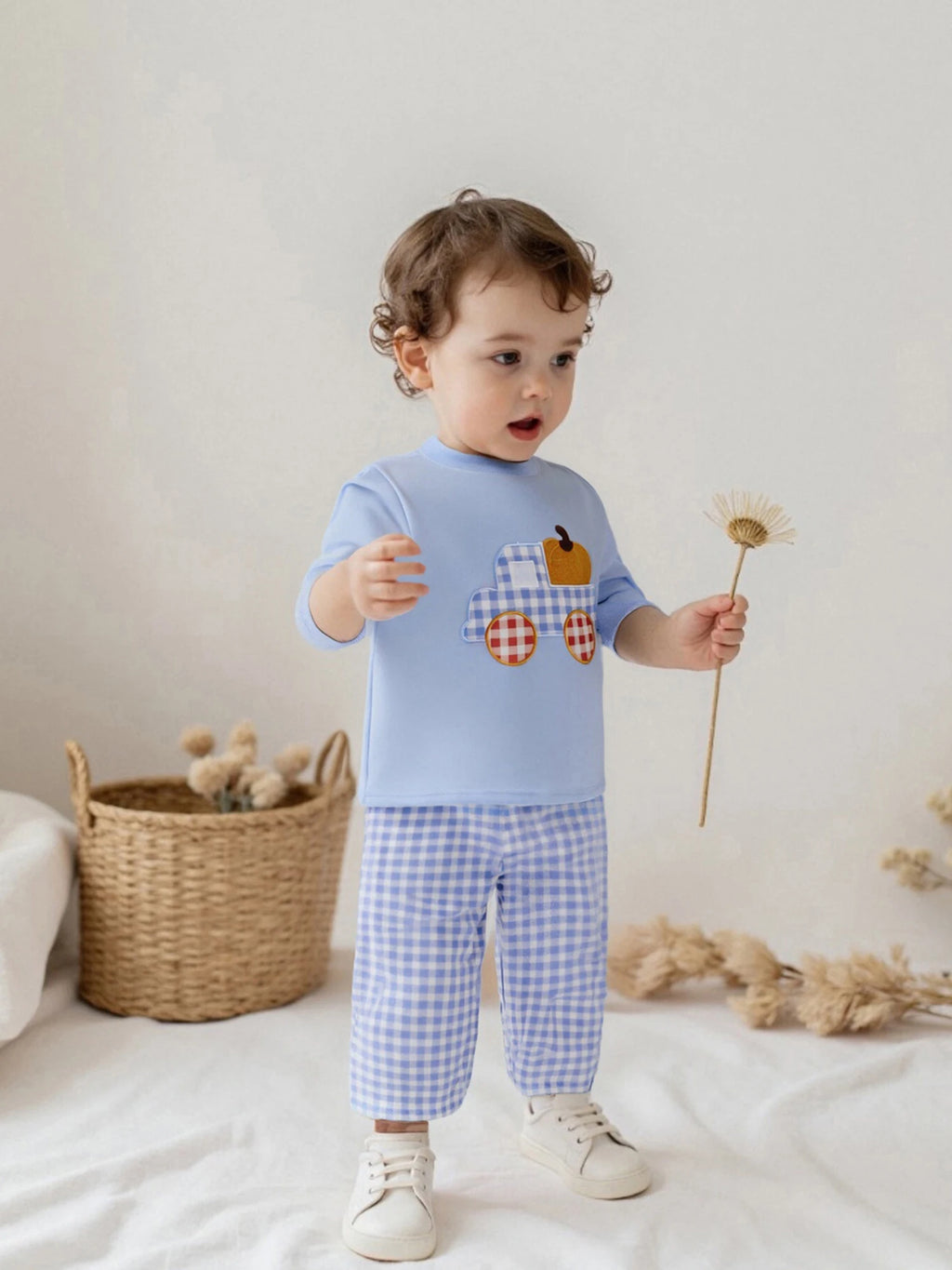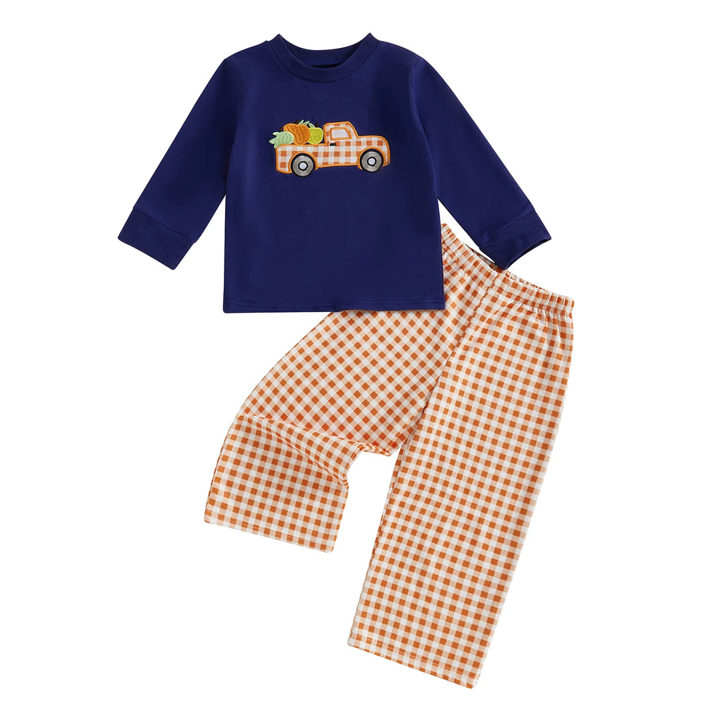 Toddler Little Boy Halloween Outfit Pumpkin Truck Embroidered Long Sleeve Tops Plaid Pants 2 Piece SetSize (cm)
