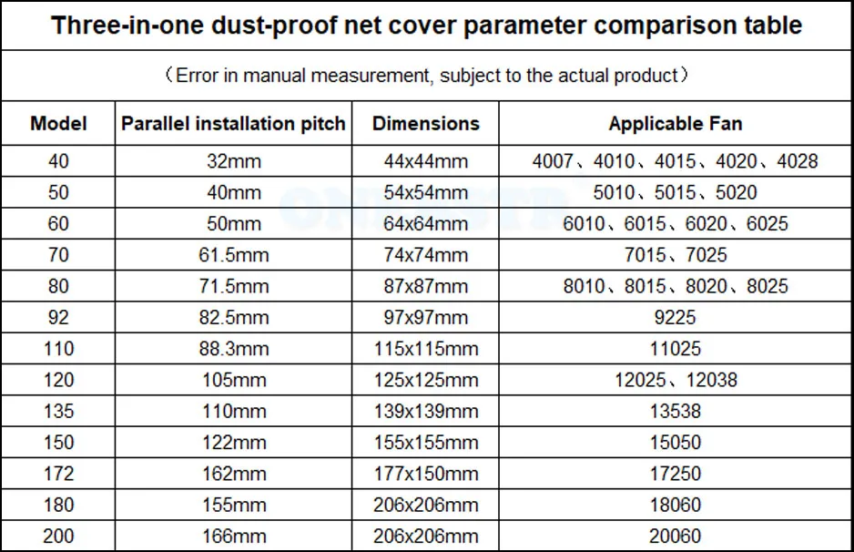 Corresponding to the size of the fan, the 4 cm fan uses a 4 cm net cover, and the rest is the same.