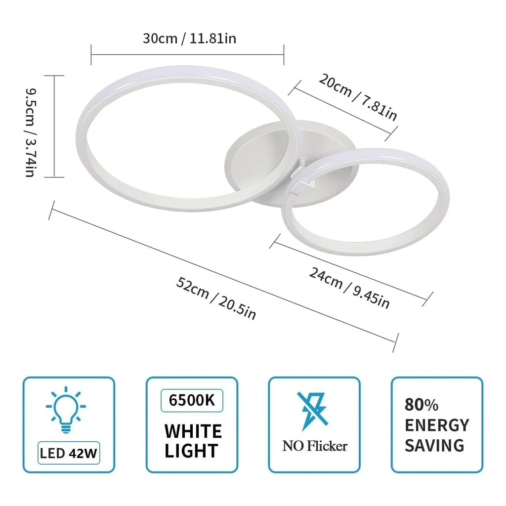 【Specifications】This ceiling light has an overall length of 52 cm and a height of 9.5 cm. The large circle has a diameter of 30 cm, the small circle has a diameter of 24 cm and the frame has a diameter of 20 cm. Wattage: 42W, 3950LM, 6500K white light. Light source: LED.