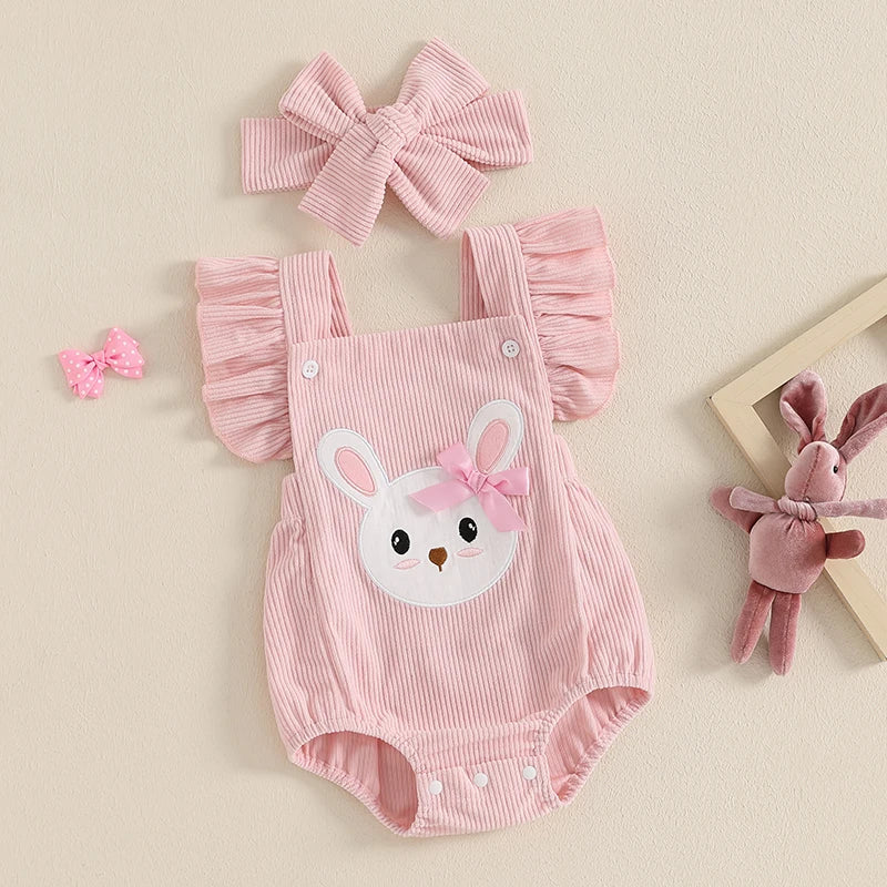 Baby Girls Rompers Easter Clothes Rabbit Embroidery Fly Sleeve Infant Bodysuits Jumpsuits with Headband