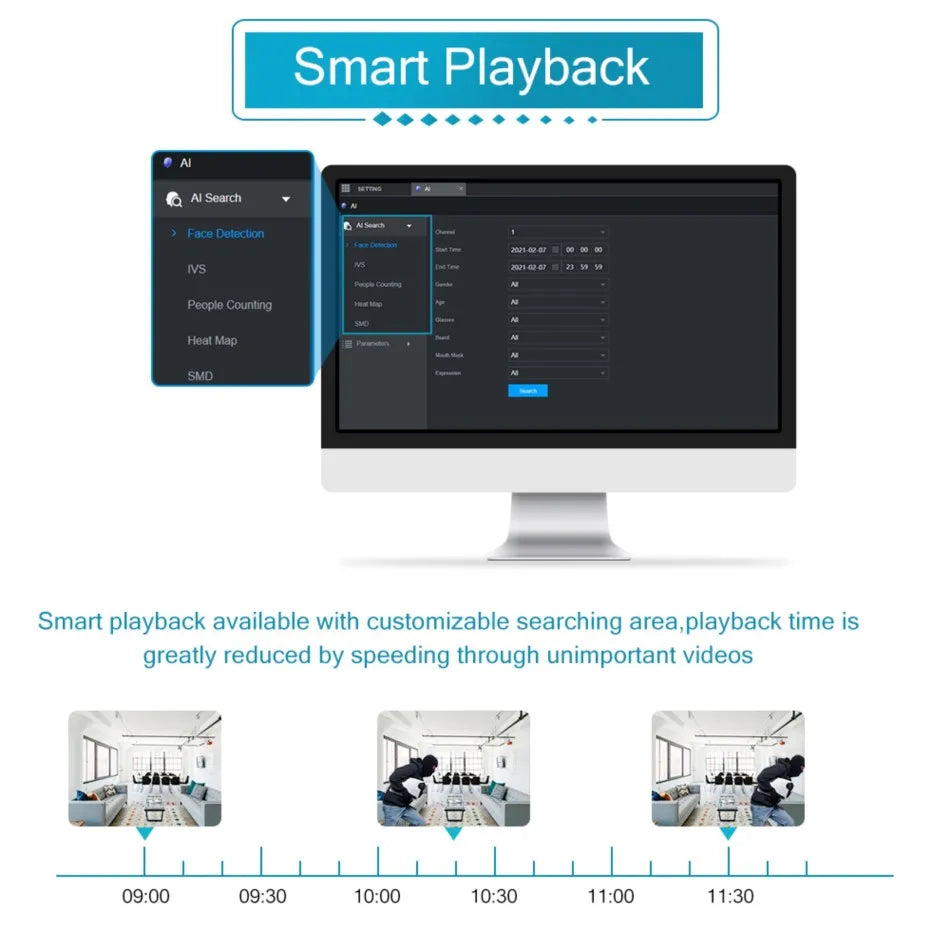 > AI by Camera supports face detection and recognition, perimeter protection, SMD Plus, people counting, stereo analysis and heat map.