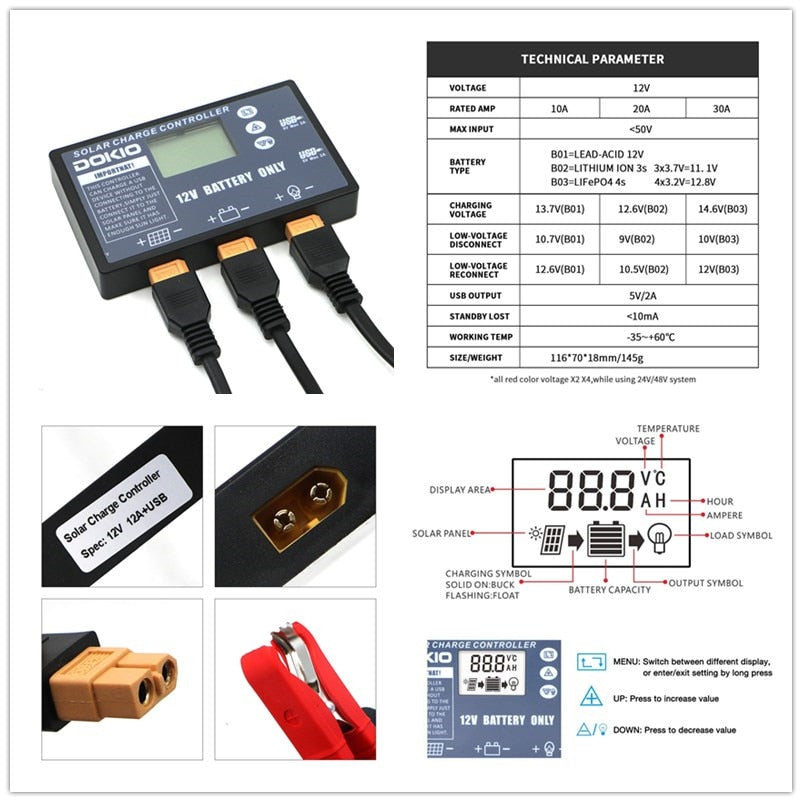 Controller support 12V lead-acid,lithium ions and LiFePO4 battries.
