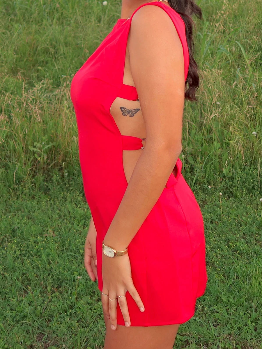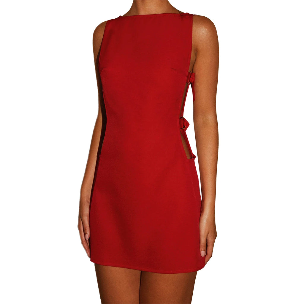Women Solid Color Tank Dress Boat Neck Side Cut Out Sleeveless Mini Bodycon Dress with BucklesSize (cm)