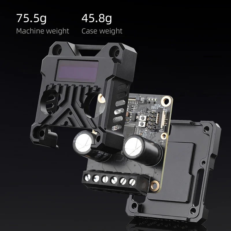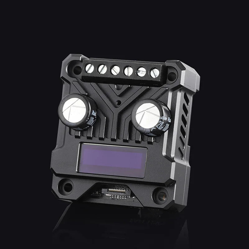 Following the chip design requirements, we provide 12V power supply for the TMC5160 chip's VSA. Additionally, the driver supports limit switches to utilize the TMC5160's unlimited limit function and includes a 12V power port for a cooling fan. The latest design armored heatsink ensures adequate cooling while offering a sleek appearance. The driver also features an LCD screen to display driver temperature and connection mode, and controllable LED lights on the back for more DIY design options.