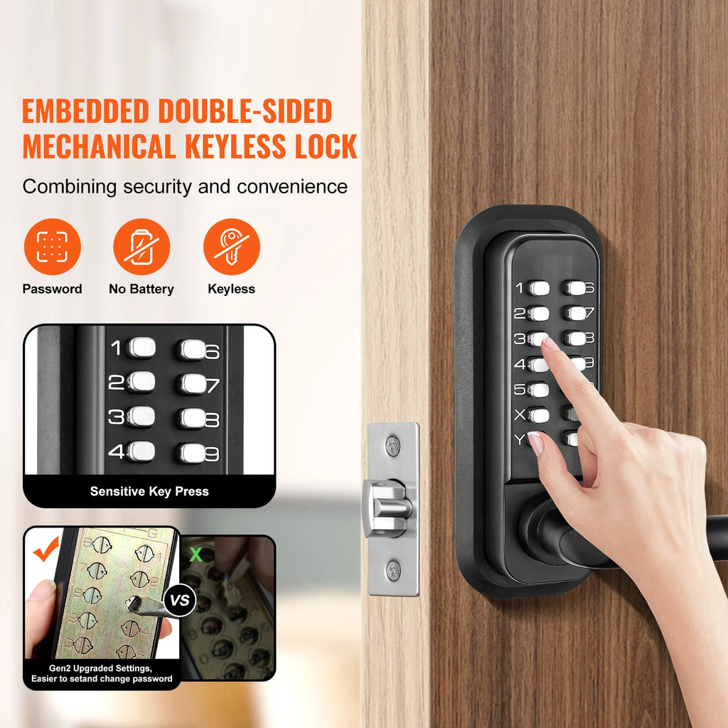 Gen2 Mechanical Keyless Lock: Our mechanical keyless entry door lock, with its full mechanical structure, makes it tough for thieves. There is no need for charging or batteries. Just enjoy easy installation and operation. The updated model makes changing the password a breeze, and the adjustable left and right handles provide greater flexibility.