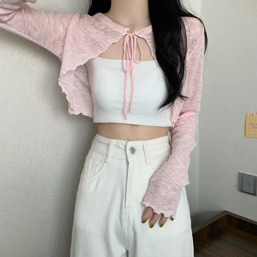 Thin Sunscreen Cardigan Lace-up Knitwear Tops Summer Women Korean Style Lantern Sleeve Short Coat Casual Sun Protected