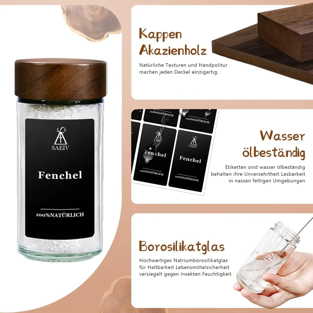 Set enthält 12/24 spice jars 、und gibt Ihnen Gewürzetiketten selbstklebend Verschlussstopfen für Gewürze、 1 Stift, 1 Edelstahltrichter und 1 Reinigungsbürste