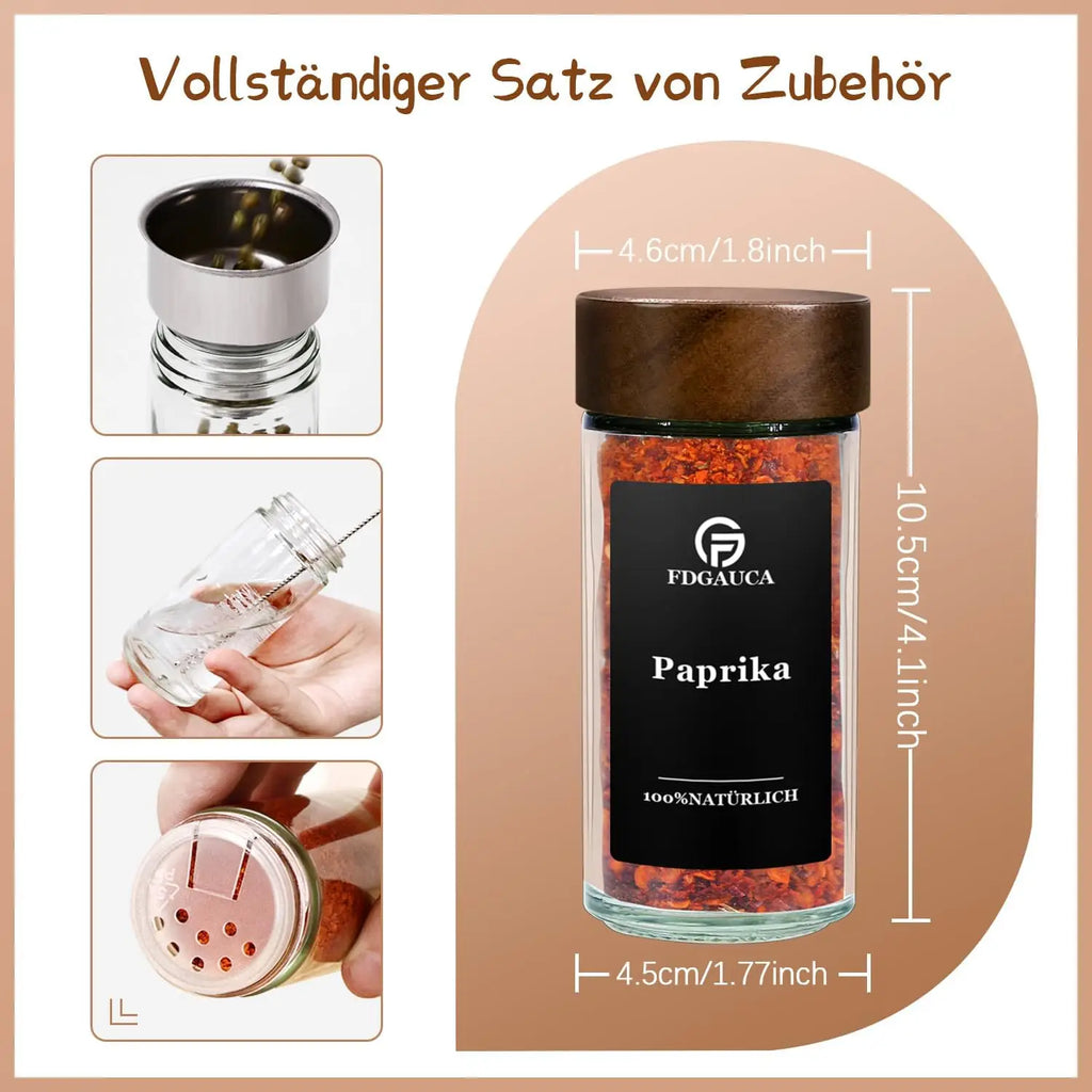 Aus hochwertigem Edelstahl und Natriumborosilikatglas, um Haltbarkeit und Lebensmittelsicherheit zu gewährleisten, luftdicht zum Schutz vor Insekten und Feuchtigkeit und um die Gewürze lange frisch und duftend zu halten