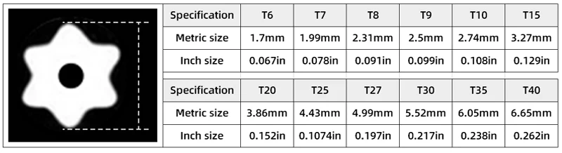 Size: T6, T7, T8, T9, T10, T15, T20, T25, T27, T30, T35,T40.