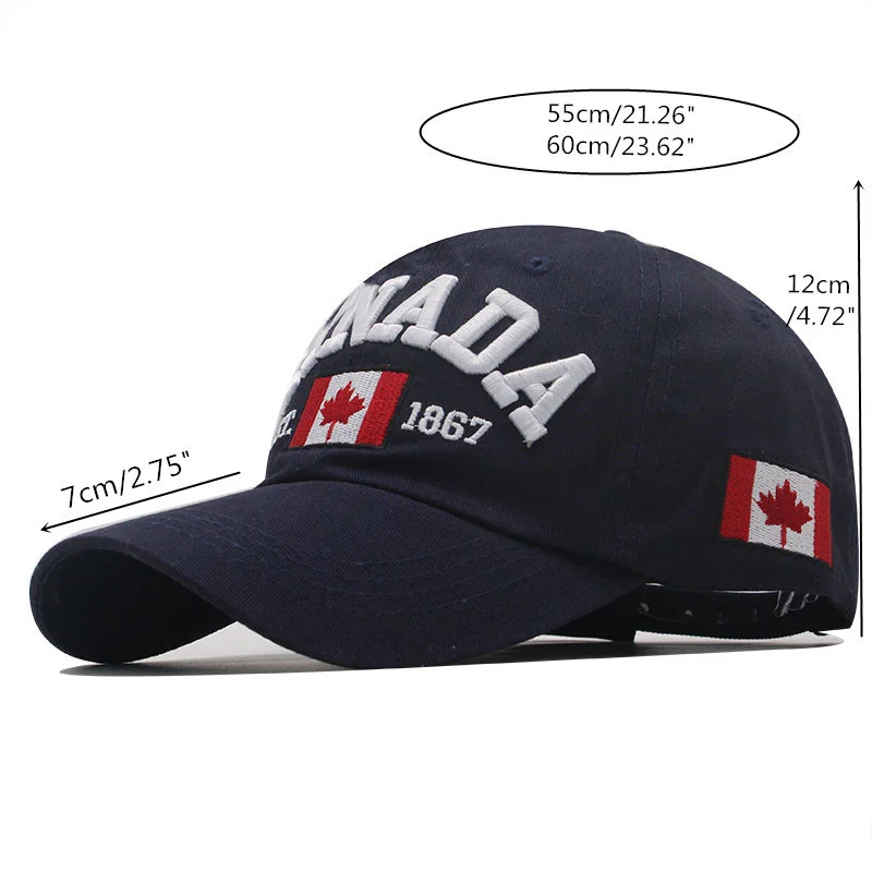 product Information name: Canadian embroidered baseball cap : F250color: 10 colors material: Cottonbrim: 7hat depth: 12cm size: 56-60 Product Weight: 100g product Features The front design of fashionable letters highlights the atmosphere, and adopts skilled sewing technology to sew, with uniform and beautiful lines, neat and concise. The brim is straight and stylish.